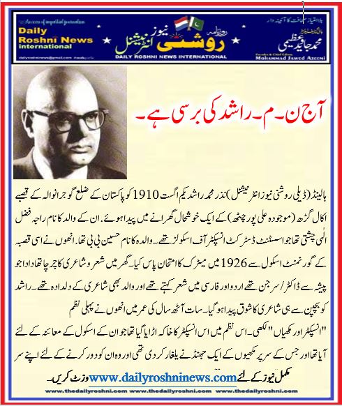 ہالینڈ(ڈیلی روشنی نیوز انٹرنیشنل )نذر محمد راشد یکم اگست 1910 کو پاکستان کے ضلع گوجرانوالہ کے قصبے اکال گڑھ (موجودہ علی پور چٹھ) کے ایک خوشحال گھرانے میں پیدا ہوئے. ان کے والد کا نام راجہ فضل الٰہی چشتی تھا جو اسسٹنٹ ڈسٹرکٹ انسپکٹر آف اسکولز تھے۔والدہ کا نام حسین بی بی تھا. انھوں نے اسی قصبہ کے گورنمنٹ اسکول سے 1926 میں میٹرک کا امتحان پاس کیا۔گھر میں شعر و شاعری کا چرچا تھا دادا جو پیشہ سے ڈاکٹر / سرجن تھے اردو اور فارسی میں شعر کہتے تھے اور والد بھی شاعری کے دلدادہ تھے۔راشد کو بچپن سے ہی شاعری کا شوق پیدا ہو گیا ۔سات آٹھ سال کی عمر میں انھوں نے پہلی نظم