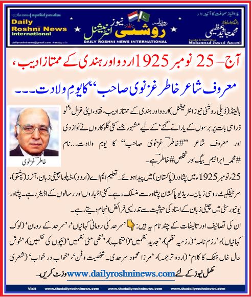 آج – 25؍نومبر 1925اردو اور ہندی کے ممتاز ادیب، معروف شاعر خاطرغزنوی صاحب“ کا یومِ ولادت…