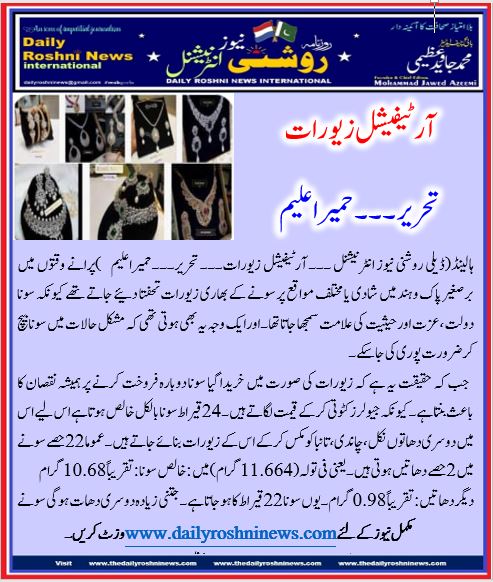 ہالینڈ(ڈیلی روشنی نیوز انٹرنیشنل ۔۔۔ آرٹیفیشل زیورات۔۔۔ تحریر۔۔۔حمیراعلیم )پرانے وقتوں میں برصغیر پاک و ہند میں شادی یا مختلف مواقع پر سونے کے بھاری زیورات تحفتا دئیے جاتے تھے کیونکہ سونا دولت، عزت اور حیثیت کی علامت سمجھا جاتا تھا ۔اورایک وجہ یہ بھی ہوتی تھی کہ مشکل حالات میں سونا بیچ کر ضرورت پوری کی جا سکے۔