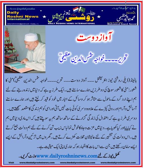 ہالینڈ(ڈیلی روشنی نیوز انٹرنیشنل ۔۔۔ آواز دوست۔۔۔ تحریر۔۔۔۔خواجہ شمس الدین عظیمیؒ)مٹی کا شعور:مٹی کا شعور سوچ کی دو طرزیں ہمارے سامنے ہیں۔ ایک طرز یہ ہے کہ دنیا میں زندہ رہنے کے لئے ہم اپنے اردگرد کے ماحول سے متاثر ہو کر وسائل کے انبار میں خود کو قید کر لیتے ہیں اور ہمارے سامنے آسائش و آرام اور روٹی کپڑے کے علاوہ دوسری کوئی بات نہیں آتی اور اسی کو ہم زندگی کا مقصد سمجھتے ہیں۔