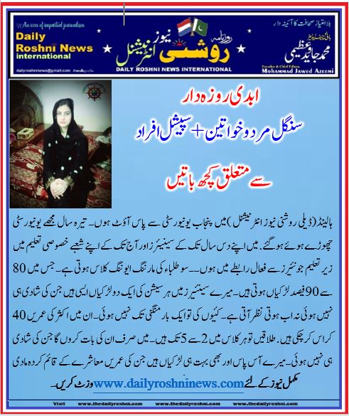 ہالینڈ(ڈیلی روشنی نیوز انٹرنیشنل )میں پنجاب یونیورسٹی سے پاس آؤٹ ہوں۔ تیرہ سال مجھے یونیورسٹی چھوڑے ہوئے ہوگئے. میں اپنے دس سال تک کے سینیئرز اور آج تک کے اپنے شعبے خصوصی تعلیم میں زیر تعلیم جونئیرز سے فعال رابطے میں ہوں۔۔سو طلباء کی مارننگ ایوننگ کلاس ہوتی ہے۔ جس میں 80 سے 90 فیصد لڑکیاں ہوتی ہیں۔ میرے سینئیرز میں ہر سیشن کی ایک دو لڑکیاں ایسی ہیں جن کی شادی ہی نہیں ہوئی نہ اب ہوتی نظر آتی ہے۔ کئیوں کی تو ایک بار منگنی تک نہیں ہوئی۔ ان میں اکثر کی عمریں 40 کراس کر چکی ہیں. طلاقیں تو ہر کلاس میں 2 سے 5 تک ہیں۔ میں صرف ان کی بات کروں گا جن کی شادی ہی نہیں ہوئی۔