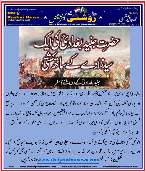 ہالینڈ(ڈیلی روشنی نیوز انٹرنیشنل )جُنید بَغْدادی رحمۃ اللہ علیہ (شروع میں) خلیفہ بغداد کے درباری پہلوان اور پوری مُملکت کی شان تھے ۔ ایک دن دربار لگا ہوا تھا کہ چوبدار نے اطلاع دی کہ صحن کے دروازے پر صبح سے ایک لاغَر و نیم جان شخص برابر اِصرار کررہا ہے کہ میرا چیلنج جُنید رحمۃ اللہ علیہ تک پہنچا دو ، میں اس سے کُشتی لڑنا چاہتا ہوں ۔ لوگوں کو بڑی حیرت ہوئی مگر خلیفہ نے درباریوں سے باہمی مشورہ کے بعد کُشتی کے مقابلے کیلئے تاریخ و جگہ مُتَعَیَّن کردی ۔