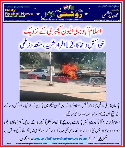 ہالینڈ(ڈیلی روشنی نیوز انٹرنیشنل )اسلام آباد کے جی الیون سیکٹر میں کچہری کے نزدیک خود کش دھماکے کے نتیجے میں 12 افراد شہید اور متعدد زخمی ہو گئے۔