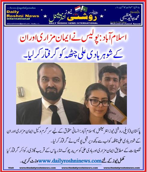 پاکستان(ڈیلی روشنی نیوز انٹڑنیشنل )اسلام آباد: انسانی حقوق کےلیے سرگرم وکیل ایمان مزاری اور ان کے شوہر ہادی علی چٹھہ کو اب سے کچھ دیر قبل پولیس نے گرفتار کر لیا ۔
