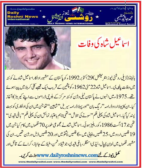 ہالینڈ(ڈیلی روشنی نیوز انٹرنیشنل )29 اکتوبر 1992ء کو پاکستان کے مشہور اداکار اسماعیل شاہ نے کوئٹہ میں وفات پاٸی ۔ اسماعیل شاہ 22 مئی 1962ء کو پشین کے قریب ایک قصبے کلی کربلا میں پیدا ہوئے تھے۔ 1975ء میں انہوں نے پاکستان ٹیلی وژن کوئٹہ مرکز کے بلوچی ڈراموں سے اپنے کیریئر کا آغاز کیا۔ ان کا پہلا اردو ڈرامہ ’’ریگ بان‘‘ اور پہلا ڈرامہ سیریل ’’شاہین‘‘ تھا جن میں ان کی اداکاری کو بہت پسند کیا گیا۔ اسماعیل شاہ کی پہلی فلم ’’سونے کی تلاش‘‘ تھی تاہم باعتبار نمائش ان کی پہلی فلم ’’باغی قیدی‘‘ تھی جو 17 اگست 1986ء کو ریلیز ہوئی۔ اسماعیل شاہ نے مجموعی طور پر 70 فلموں میں کام کیا جن میں 19 فلمیں اردو میں، 25 فلمیں پنجابی میں ، 6 فلمیں پشتو میں اور 20 فلمیں ڈبل ورژن تھیں۔ ان کی مشہور فلموں میں لو اِن نیپال، لیڈی اسمگلر، باغی قیدی، جوشیلا دشمن، منیلا کے جانباز، کرائے کے قاتل اور وطن کے رکھوالے کے نام شامل ہیں۔