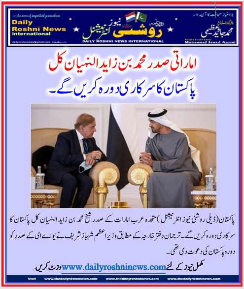 پاکستان(ڈیلی روشنی نیوز انٹرنیشنل )متحدہ عرب امارات کے صدر شیخ محمد بن زاید النہیان کل پاکستان کا سرکاری دورہ کریں گے۔