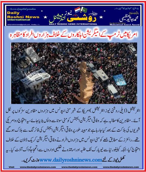 انٹرنیشنل (ڈیلی روشنی نیوز انٹرنیشنل )امریکا کے شہر منی ایپولس میں ہزاروں مظاہرین سڑکوں پر نکل آئے۔ مظاہرین کا مطالبہ ہے کہ وفاقی امیگریشن ایجنٹس کو منی سوٹا سے واپس بلایا جائے، یہ احتجاج دو امریکی شہریوں کی ہلاکت کے بعد کیا جا رہا ہے جو مبینہ طور پر وفاقی امیگریشن ایجنٹس کی فائرنگ سے ہلاک ہوگئے تھے۔