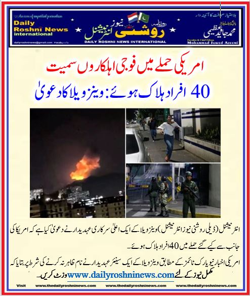 انٹرنیشنل (ڈیلی روشنی نیوز انٹرنیشنل )وینزویلا کے ایک اعلیٰ سرکاری عہدیدار نے دعویٰ کیا ہے کہ امریکا کی جانب سے کیے گئے حملے میں 40 افراد ہلاک ہوئے۔