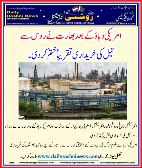 انٹرنیشنل (ڈیلی روشنی نیوز انٹرنیشنل)مغربی پابندیوں کے خدشات اور امریکی دباؤ کے بعد بھارت نے روس سے تیل کی خریداری تقریباً بند کر دی۔