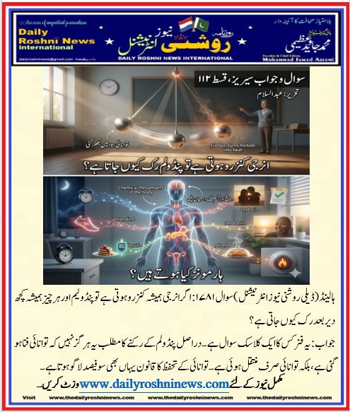 ہالینڈ(ڈیلی روشنی نیوز انٹرنیشنل )سوال ۱۷۸۱: اگر انرجی ہمیشہ کنزرو ہوتی ہے تو پنڈولیم اور ہر چیز ہمیشہ کچھ دیر بعد رک کیوں جاتی ہے؟