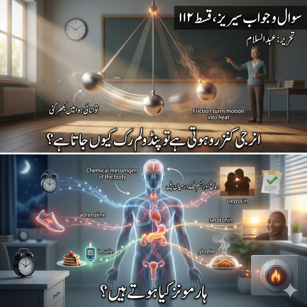 جواب: یہ فزکس کا ایک کلاسک سوال ہے۔ دراصل پنڈولم کے رکنے کا مطلب یہ ہرگز نہیں کہ توانائی فنا ہو گئی ہے، بلکہ توانائی صرف منتقل ہوئی ہے۔ توانائی کے تحفظ کا قانون یہاں بھی سو فیصد لاگو ہوتا ہے۔