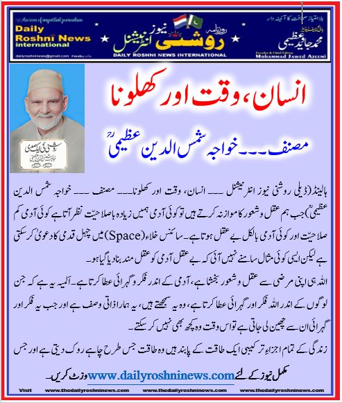 ہالینڈ(ڈیلی روشنی نیوز انٹرنیشنل ۔۔۔ انسان، وقت اور کھلونا۔۔۔ مصنف ۔۔۔ خواجہ شمس الدین عظیمیؒ)جب ہم عقل و شعور کا موازنہ کرتے ہیں تو کوئی آدمی ہمیں زیادہ با صلاحیّت نظر آتا ہے کوئی آدمی کم صلاحیّت اور کوئی آدمی بالکل بےعقل ہوتا ہے۔ سائنس خلاء (Space) میں چہل قدمی کا دعویٰ کر سکتی ہے لیکن ایسی کوئی مثال سامنے نہیں آئی کہ بےعقل آدمی کو عقل مند بنا دیا گیا ہو۔