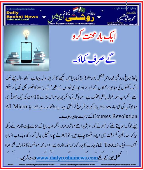 ہالینڈ(ڈیلی روشنی نیوز انٹرنیشنل )دوستو!آج کی دنیا میں سیکھنے کا طریقہ بدل چکا ہے۔ کچھ سال پہلے تک لوگ گھنٹوں کی ویڈیوز، مہینوں کے کورسز اور بھاری فیسوں کے بغیر آگے بڑھنے کا تصور بھی نہیں کر سکتے تھے۔ مگر اب صورتحال بالکل مختلف ہے۔ موبائل کی اسکرین پر صرف 5 سے 10 منٹ کی ایک چھوٹی سی ویڈیو آپ کی نئی مہارت، نیا ہنر یا نیا کیریئر شروع کرا سکتی ہے۔ یہ وہ انقلاب ہے جسے دنیا AI Micro-Courses Revolution کے نام سے جان رہی ہے۔