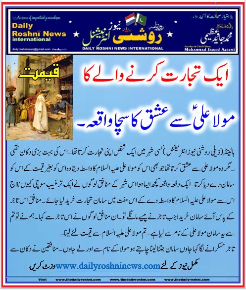 ہالینڈ(ڈیلی روشنی  نیوز انٹرنیشنل )کسی شہر میں ایک شخص اپنی تجارت کرتا تھا ۔اس کی بہت بڑی دکان تھی ۔مگر وہ مولا علی سے عشق کرتا تھا جو بھی اس کو مولا علی علیہ السلام کا واسطہ دیتا وہ اس کو بغير قیمت کے اس کو سامان دے دیا کرتا ۔ایک دفعہ واقعہ کچھ ایسا ہوا اس شہر کے منافق لوگوں نے ایک ترغيب سوچی کیوں نا اج اس سے مولا علی علیہ السلام کا واسطہ دے کے اس مفت میں سامان تجارت خرید لیا جائے ۔منافق اس تاجر کے پاس آئے سامان خریدا جب تاجر نے پیسے مانگے تو ۔ان منافق لوگوں نے اس تاجر سے کہا ۔ہم نے تو تم سے یہ سامان مولا علی کے نام سے لیا ہے ۔تم مولا علی علیہ السلام سے قیمت لئے لینا ۔