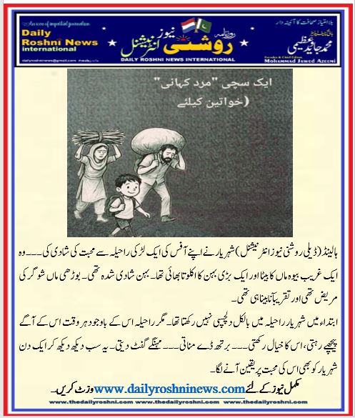 ہالینڈ(ڈیلی روشنی نیوز انٹرنیشنل )شہریار نے اپنے آفس کی ایک لڑکی راحیلہ سے محبت کی شادی کی۔۔۔ وہ ایک غریب بیوہ ماں کا بیٹا اور ایک بڑی بہن کا اکلوتا بھائی تھا۔ بہن شادی شدہ تھی۔ بوڑھی ماں شوگر کی مریض تھی اور تقریبآ نابینا ہی تھی۔