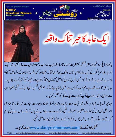 ہالینڈ(ڈیلی روشنی نیوز انٹرنیشنل )حضرت مولانا قاری محمد طیب صاحب رحمۃ اللہ علیہ نے اپنی مجلس میں ایک مرتبہ بنی اسرائیل کے ایک عابد کا عبہ تناک واقعہ بیان فرمایا تھا کہ شیطان کس طرح انسان کے دل میں گناہ کا وسوسہ ڈالتا ہے اور آہستہ آہستہ کس طرح انسان کو اصل گناہ میں مبتلا کرتا ہے اور کیسے کیسے گناہ کروا دیتا ہے۔