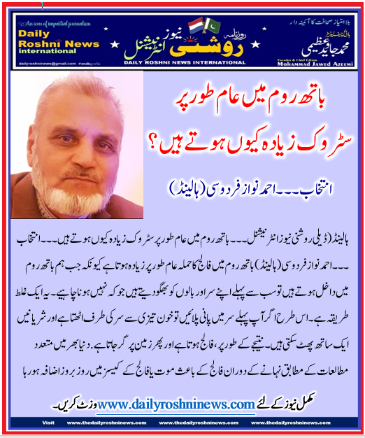 ہالینڈ(ڈیلی روشنی نیوز انٹرنیشنل ۔۔۔باتھ روم میں عام طور پر سٹروک زیادہ کیوں ہوتے ہیں ۔۔۔ انتخاب ۔۔۔احمد نواز فردوسی (ہالینڈ)باتھ روم میں فالج کا حملہ عام طور پر زیادہ ہوتا ہے کیونکہ جب ہم باتھ روم میں داخل ہوتے ہیں تو سب سے پہلے اپنے سر اور بالوں کو بھگو دیتے ہیں جو کہ نہیں ہونا چاہیے۔ یہ ایک غلط طریقہ ہے۔اس طرح اگر آپ پہلے سر میں پانی پلائیں تو خون تیزی سے سر کی طرف اٹھتا ہے اور شریانیں ایک ساتھ پھٹ سکتی ہیں۔ نتیجے کے طور پر، فالج ہوتا ہے اور پھر زمین پر گر جاتا ہے.دنیا بھر میں متعدد مطالعات کے مطابق نہانے کے دوران فالج کے باعث موت یا فالج کے کیسز میں روز بروز اضافہ ہو رہا
