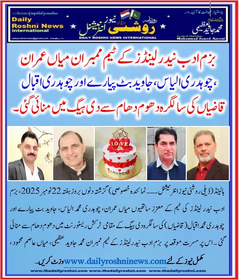 ہالینڈ(ڈیلی روشنی نیوز انٹرنیشنل ۔۔۔ نمائندہ خصوصی) گزشتہ دنوں بروز ہفتہ 22 نومبر 2025 ، بزم ادب نیدر لینڈز کی ٹیم کے معزز ساتھیوں میاں عمران، چوہدری محمد الیاس، جاوید بٹ پیارے اور چوہدری محمد اقبال( قاضیاں ) کی سالگرہ دی ہیگ کے مقامی ٹرکش ریسٹورنٹ میں دھوم دھام سے منائی گئی ۔ اس پر مسرت موقعہ پر بزم ادب نیدرلینڈز کےٹیم ممبران محمد جاوید عظیمی، میاں عاصم محمود ، چوہدری اکرام الحق چوہدری بنارس، چوہدری محمد اصغر، راجہ فاروق حیدر،میاں آفتاب ، علی اعجاز اور ان کے صاحبزادے اذان علی نے مل کر کیک کاٹا اور صمیم قلب سے مبارکباد پیش کرتے ہوئے ان کی صحت و تندرستی اور زندگی میں خیر و برکت کی دعائیں بھی کیں ۔