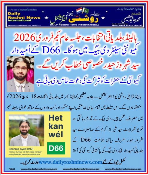 ہالینڈ(ڈیلی روشنی نیو ز انٹر نیشنل ۔۔جاوید عظیمی) ہالینڈ بھر میں بلدیاتی انتخابات18 مارچ 2026 کو منعقد ہوں گے۔ اس سلسلے میں تمام سیاسی جماعتیں اپنے منشور اور اُمیدواروں کے ساتھ  عوامی رابطہ  مہم میں مصروف عمل ہیں۔ دی ہیگ کے قدیم رہائشی اور فزیو تھراپسٹ سید شیر از اکرم کے صاحبزادے سید شہروز حیدر معروف سیاسی جماعت ڈی66 کے بلدیاتی اُمیدوار  جبکہ دی ہیگ کی  پاکستانی کمیونٹی کی آواز بھی ہیں ۔ ان کی انتخابی مہم کے سلسلے میں بروز اتوار یکم فروری 2026 کو بعد نماز عصر تین بجے پاکستان اسلامک اینڈ کلچرل سینٹر دی ہیگ میں جلسہ عام منعقد کیا جارہا ہے ۔ پاکستانی کمیونٹی کے حضرات کو مذکورہ جلسے میں شرکت کے لئے دعوت خاص دی جاتی ہے۔مزید معلومات کے لئے خبر کے ساتھ شائع شدہ پوسٹر کامطالعہ ضرور کریں ۔