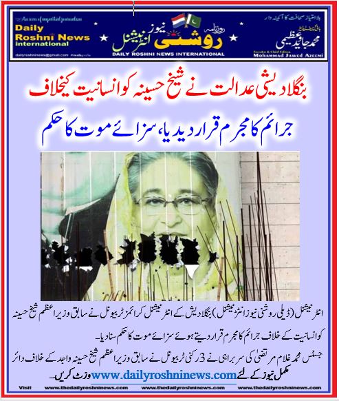 انٹرنیشنل (ڈیلی روشنی نیوز انٹڑنیشنل )بنگلا دیش کے انٹرنیشنل کرائمز ٹربیونل نے سابق وزیراعظم شیخ حسینہ کو انسانیت کے خلاف جرائم کامجرم قرار دیتے ہوئے سزائے موت کا حکم سنا دیا۔