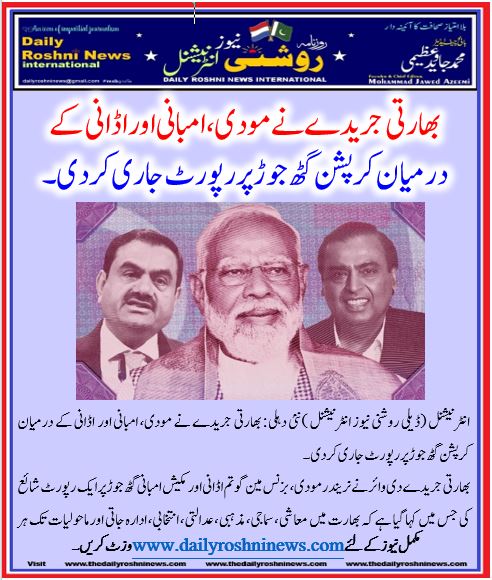 بھارتی جریدے دی وائر نے نریندر مودی، بزنس مین گوتم اڈانی اور مکیش امبانی گٹھ جوڑ پر ایک رپورٹ شائع کی جس میں کہا گیا ہے کہ بھارت میں معاشی، سماجی، مذہبی، عدالتی، انتخابی، ادارہ جاتی اور ماحولیات تک ہر شعبہ کرپشن کی لپیٹ میں ہے، بھارت میں نفرت، تقسیم، مذہبی تعصب اورکرپشن حکومتی سرپرستی میں عام ہوچکی ہے۔