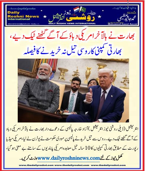 انٹرنیشنل (ڈیلی روشنی نیوز انٹرنیشنل )آزاد خارجہ پالیسی کے دعوے دار بھارت نے بالآخر امریکی دباو کےآگے گھٹنے ٹیک دیے۔روس سے تیل خریدنے پالیسی پر مودی حکومت نے یو ٹرن لے لیا، امریکی میڈیا رپورٹ کے مطابق بھارتی کمپنیوں کا 10 سالہ تیل معاہدہ امریکی پابندیوں کے سامنے بے معنی ہو گیا، مودی کے قریبی ارب پتی تاجر دوست مکیش امبانی نے بھی امریکی حکم مان کر روسی تیل خریدنا چھوڑ دیا۔