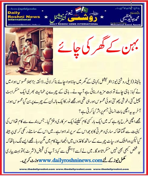 ہالینڈ(ڈیلی روشنی نیوز انٹرنیشنل )باجی کے گھر میں جانا ہوا، چائے بنا کر لائی۔ ذائقہ بڑا بھلا محسوس ہوا، میں نے کہا: باجی چائے تو بہت مزیدار بنائی ہے آپ نے۔ باجی کے چہرے پر طمانیت بھری ایک مسکراہٹ پھیل گئی، خوشی پھوٹتی ہوئی محسوس ہو رہی تھی اور مجھے نور کا ایک ہالہ اُن کے چہرے پر بن گیا محسوس ہوا۔