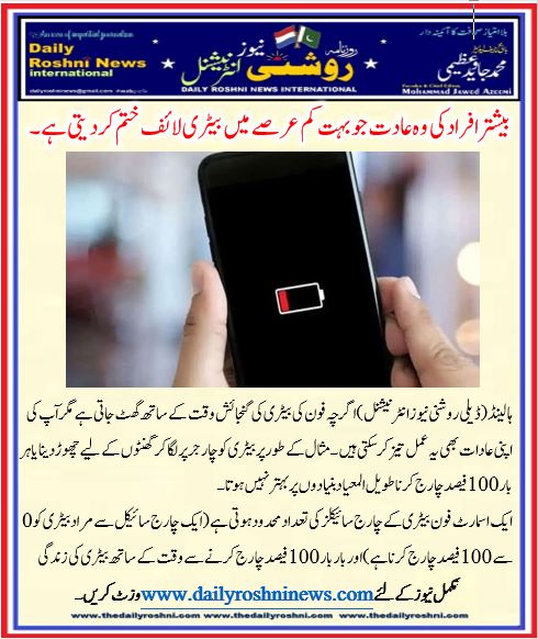 ہالینڈ(ڈیلی روشنی نیوز انٹرنیشنل )اگرچہ فون کی بیٹری کی گنجائش وقت کے ساتھ گھٹ جاتی ہے مگر آپ کی اپنی عادات بھی یہ عمل تیز کرسکتی ہیں۔مثال کے طور پر بیٹری کو چارجر پر لگا کر گھنٹوں کے لیے چھوڑ دینا یا ہر بار 100 فیصد چارج کرنا طویل المعیاد بنیادوں پر بہتر نہیں ہوتا۔
