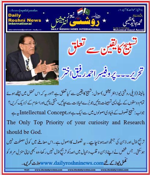 ہالینڈ(ڈیلی روشنی نیوز انٹرنیشنل )سوال : تسبیح کا یقین سے کیا تعلق ہے ؟ اور یہ کہ اس محفل میں بیٹھے ہوئے تمام دوستوں کے لیے ایسی تسبیحات بتائیں جو بُرے خیالات سے بچائیں، متقی بنائیں اور اسلام کے نزدیک کریں ؟