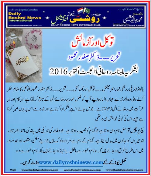 ہالینڈ(ڈیلی روشنی نیوز انٹرنیشنل ۔۔۔ توکل اور آزمائش۔۔۔ تحریر۔۔۔ڈاکٹر صفدر محمود)توکل کا مقام نظر آنے والی وہ بلندی  ہے جہاں انسان اپنے آپ کو مکمل طور  پررضا ئے الہی  کے تابع کر لیتا ہے، ہر کام اور ہر حرکت میں رضا نے الہی ڈھونڈتا ہے۔  جو مل  جائے اس پر شکر ادا کرتا ہے اورجو نہ ملے  اس پر یوں صبر کرتا ہے جیسے اس کی کوئی خواہش ہی نہ تھی۔