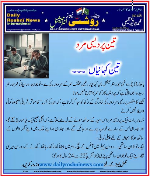 ہالینڈ(ڈیلی روشنی نیوز انٹرنیشنل )یہ کہانیاں تین مختلف عمر کے مردوں کی ہے – نوجوان، درمیانی عمر اور عمر رسیدہ – جو بتاتی ہے کہ پردیس کا دکھ عمر کا محتاج نہیں ہوتا