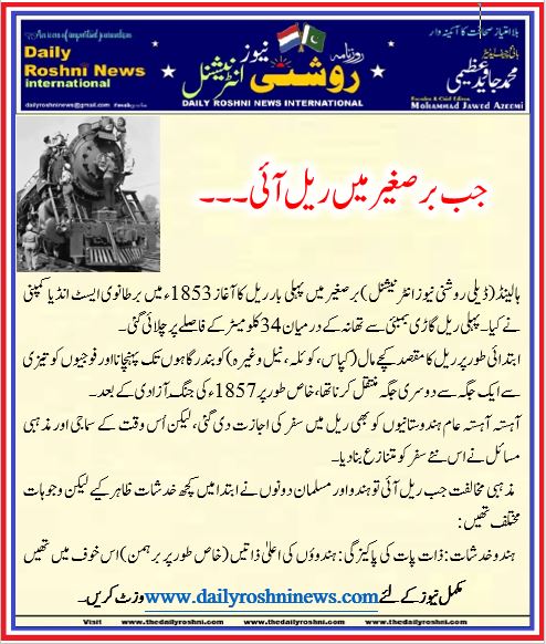 ہالینڈ(ڈیلی روشنی نیوز انٹرنیشنل )برصغیر میں پہلی بار ریل کا آغاز 1853ء میں برطانوی ایسٹ انڈیا کمپنی نے کیا۔ پہلی ریل گاڑی بمبئی سے تھانہ کے درمیان 34 کلومیٹر کے فاصلے پر چلائی گئی۔