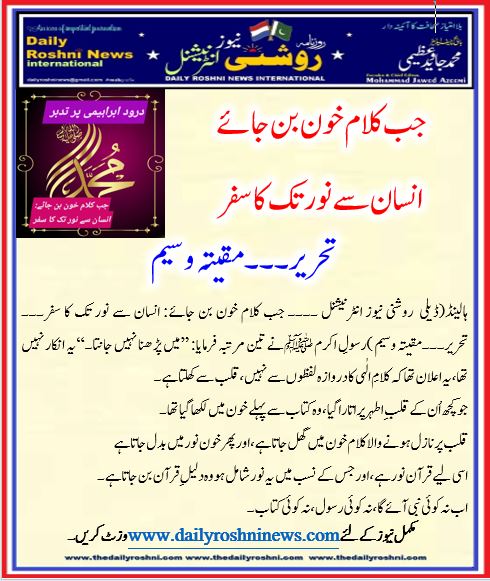 ہالینڈ(ڈیلی  روشنی نیوز انٹرنیشنل ۔۔۔۔ جب کلام خون بن جائے: انسان سے نور تک کا سفر۔۔۔ تحریر۔۔۔مقیتہ وسیم )رسولِ اکرم ﷺنے تین مرتبہ فرمایا: ’’میں پڑھنا نہیں جانتا۔‘‘
