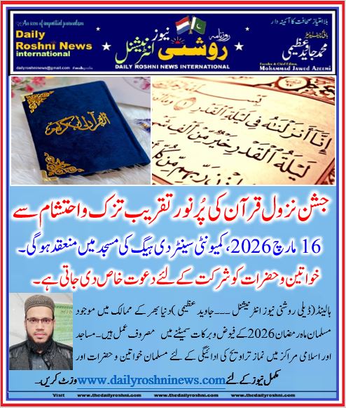ہالینڈ(ڈیلی روشنی نیوز انٹرنیشنل ۔۔۔جاوید عظیمی )دنیا بھر کے ممالک میں موجود مسلمان ماہ رمضان 2026کے فیوض و برکات سمیٹنے میں مصروف عمل ہیں ۔ مساجد اور اسلامی مراکز میں نماز تراویح کی ادائیگی کے لئے مسلمان خواتین و حضرات اور نوجوان کثیر تعداد میں جذبہ ایمانی کے تحت ذوق و شوق سے شریک ہورہے ہیں۔ پاکستان اسلامک اینڈ کلچرل  سینٹر دی ہیگ کی جامع مسجد میں بھی نماز تراویح اور کثرت عبادات کا تسلسل جاری ہے ۔ متذکرہ مرکز میں حافظ ناظم رضا اپنی دلنشین آواز  اور خوبصورت تلفظ کی ادائیگی کے ساتھ نماز تراویح کی امامت کروانے میں مصروف عمل ہیں۔مذکورہ مرکز کی انتظامیہ کے زیر انتظام و انصرام جشن نزول قرآن کی پُر نور برکتوں سے معمور تقریب بروز سوموار 16 مارچ 2026 نماز تراویح کے اختتام پر تزک و احتشام سے منعقد کی جائے گی ۔ برکتوں اور رحمتوں سے معمور تقریب میں شرکت کے لئے خواتین و حضرات اور نوجوانوں کودعوت خاص دی جاتی ہے ۔ انتظامیہ ملتمس ہے کہ وقت کی پابندی کو ملحوظ خاطر رکھیں ۔