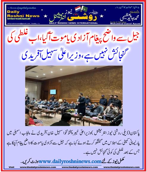 وزیراعلیٰ خیبرپختونخوا سہیل خان آفریدی نے پنجاب اسمبلی میں پارلیمانی کمیٹی کے اجلاس میں گفتگو کرتے ہوئے کہا ہے کہ جیل سے آزادی یا موت کا واضح پیغام آچکا ہے جس کے بعد غلطی کی کوئی گنجائش نہیں ہے۔