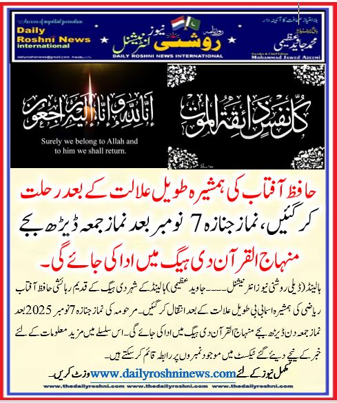 ہالینڈ ( ڈیلی روشنی نیوز انٹرنیشنل ۔۔۔۔ جاوید عظیمی ) ہالینڈ کے شہر دی ہیگ کے قدیم رہائشی حافظ آفتاب ریاضی کی ہمشیرہ اسما بی بی طویل علالت کے بعد انتقال کر گئیں۔ مرحومہ کی نماز جنازہ 7 نومبر 2025 بعد نماز جمعہ دن ڈیڑھ بجے منہاج القرآن دی ہیگ میں ادا کی جائے گی۔ اس سلسلے میں مزید معلومات کے لئے خبر کے نیچے دیئے گئے ٹیکسٹ میں موجود نمبروں پر رابطہ قائم کر سکتے ہیں ۔