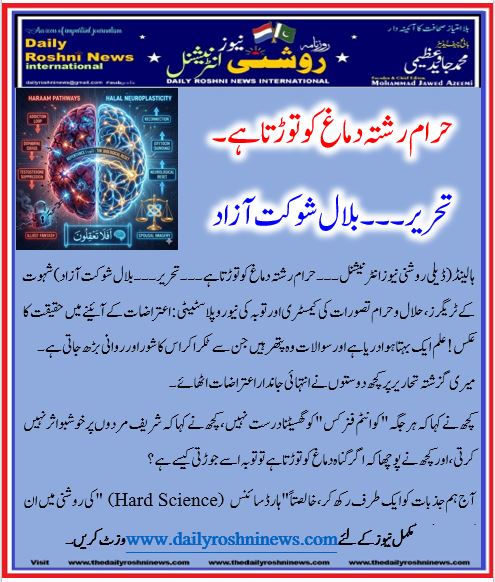ہالینڈ(ڈیلی روشنی نیوز انٹرنیشنل ۔۔۔ حرام رشتہ دماغ کو توڑتا ہے۔۔۔ تحریر۔۔۔ بلال شوکت آزاد)شہوت کے ٹریگرز، حلال و حرام تصورات کی کیمسٹری اور توبہ کی نیوروپلاسٹیٹی: اعتراضات کے آئینے میں حقیقت کا عکس!