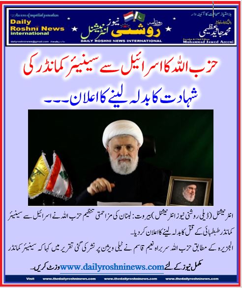 انٹرنیشنل (ڈیلی روشنی نیوز انٹرنیشنل )بیروت: لبنان کی مزاحمتی تنظیم حزب اللہ نے اسرائیل سے سینیئر کمانڈر طبطبائی کے قتل کا بدلہ لینے کا اعلان کر دیا۔