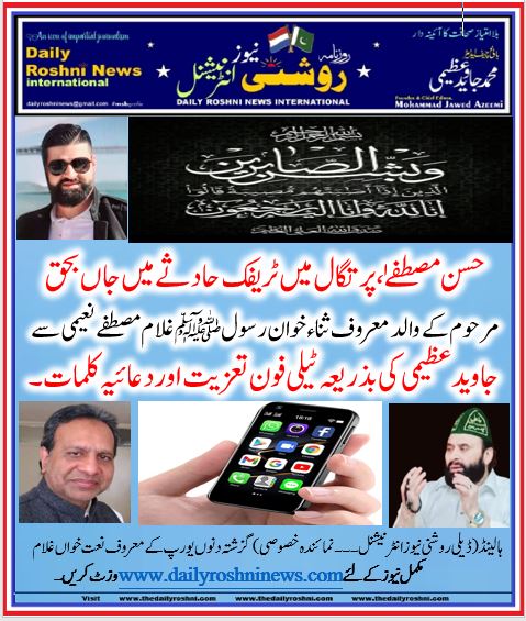 ہالینڈ(ڈیلی روشنی نیوز انٹر نیشنل۔۔۔ نمائندہ خصوصی) گزشتہ دنوں یورپ کے معروف نعت خواں غلام مصطفیٰ نعیمی کے صاحبزادے حسن مصطفے  ٰجو پرتگال  میں رہائش پزیر تھے ایک ٹریفک حادثے میں جاں بحق ہو گئے۔ مرحوم کے والد سے آن لائن اردو اخبار ڈیلی روشنی نیوز انٹرنیشنل کے مدیر اعلیٰ محمد جاوید عظیمی  کی گزشتہ روز بروز اتوار 26اکتوبر 2025کو بذریعہ ٹیلی فون تعزیت اور حسن مصطفےٰ مرحوم  کی بخشش مغفرت کے لئے بارگاہ الہی میں خصوصی مناجات پیش  کیں۔ گفتگو کے دوران نعت خواں غلام مصطفے ٰنعیمی اپنے  صاحبزادےکی حادثاتی موت کا تذکرہ کرتے ہوئے پھوٹ پھوٹ کر رونے لگے،جس پر جاوید عظیمی نے انھیں پر سا  دیتے ہوئے صبر جمیل  پر عمل پیرا ہونے کے لئے التماس کی جاوید عظیمی نے مزید کہا کہ نعت خوانی آپ کے خاندان کا ورثہ ہے اللہ تعالٰی اپنے فضل و کرم اور رسول محتشم ﷺکے صدقے سے مرحوم  کو اپنا خاص قرب عطا فرمائیں ۔آمین ثمہ آمین ۔گفتگو کے اختتام پر غلام مصطفےٰ