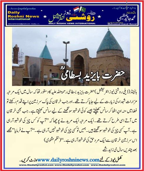 ہالینڈ(ڈیلی روشنی نیوز انٹرنیشنل )حضرت بایزید بسطامی رحمۃ اللہ علیہ کا دستور تھا کہ سال میں ایک مرتبہ مزارات شہداء کی زیارت کے لیے جایا کرتے تھے۔ اور جب خرقان کی پاک سرزمین پر اپنے قدم رکھتے تو فضا میں منہ اوپر اٹھا کر سانس کھینچتے جیسے کوئی خوشبو سونگھنے کے لیے سانس کھینچتا ہے۔ جب بھی خرقان میں آتے اسی طرح کرتے تھے۔ ایک مرتبہ ایک مرید نے پوچھا کہ ”آپ کو کس چیز کی خوشبو آرہی ہے۔ آپ کسی چیز کی خوشبو سونگھتے ہیں۔ ہمیں تو کسی چیز کی خوشبو نہیں آرہی ہے۔“ آپ نے فرمایا ”مجھے اس سرزمین خرقان سے ایک مرد حق کی خوشبو آرہی ہے۔“ (نظم مثنوی)
