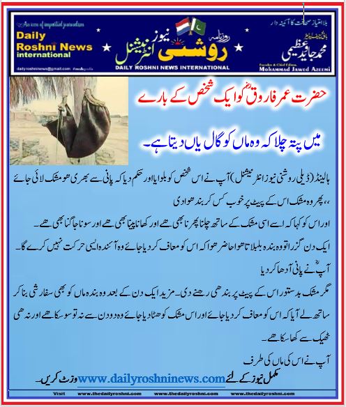 ہالینڈ(ڈیلی روشنی نیوز انٹرنیشنل )آپ نے اس شخص کو بلوایا اور حکم دیا کہ پانی سے بھری ھو مشک لائی جائے ،، پھر وہ مشک اس کے پیٹ پر خوب کس کر بندھوا دی