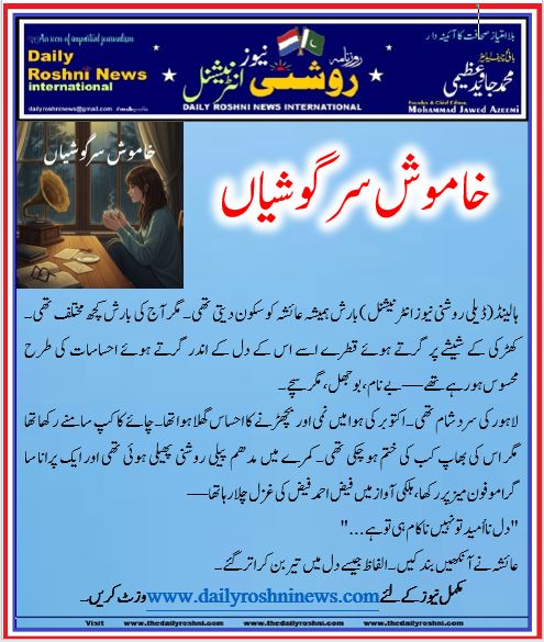 ہالینڈ(ڈیلی روشنی نیوز انٹرنیشنل )بارش ہمیشہ عائشہ کو سکون دیتی تھی۔ مگر آج کی بارش کچھ مختلف تھی۔ کھڑکی کے شیشے پر گرتے ہوئے قطرے اسے اس کے دل کے اندر گرتے ہوئے احساسات کی طرح محسوس ہو رہے تھے — بے نام، بوجھل، مگر سچے۔
