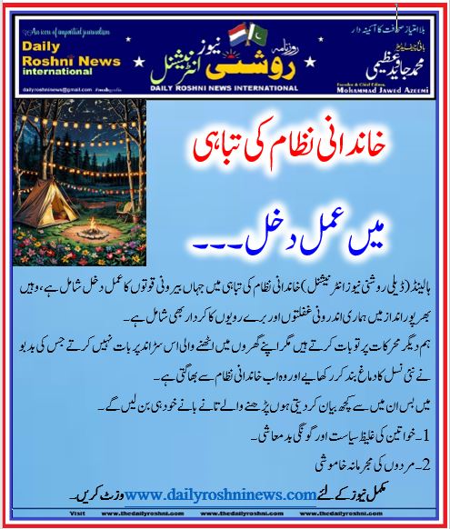 ہالینڈ(ڈیلی روشنی نیوز انٹرنیشنل )خاندانی نظام کی تباہی میں جہاں بیرونی قوتوں کا عمل دخل شامل ہے، وہیں بھرپور انداز میں ہماری اندرونی غفلتوں اور برے رویوں کا کردار بھی شامل ہے۔