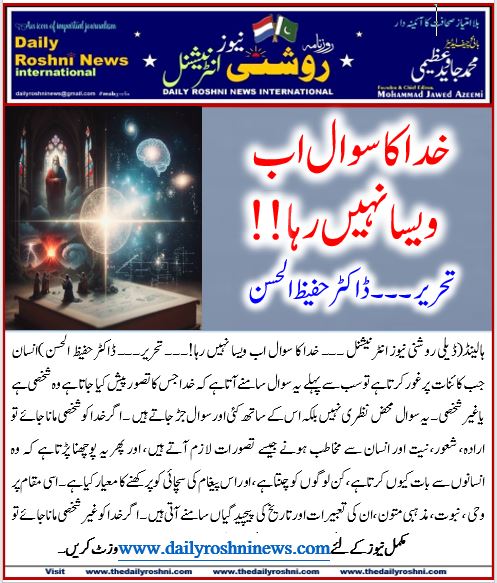 ہالینڈ(ڈیلی روشنی نیوز انٹرنیشنل ۔۔۔ خدا کا سوال اب ویسا نہیں رہا!۔۔۔ تحریر۔۔۔ ڈاکٹر حفیظ الحسن )انسان جب کائنات پر غور کرتا ہے تو سب سے پہلے یہ سوال سامنے آتا ہے کہ خدا جس کا تصور پیش کیا جاتا ہے وہ شخصی ہے یا غیر شخصی۔ یہ سوال محض نظری نہیں بلکہ اس کے ساتھ کئی اور سوال جڑ جاتے ہیں۔ اگر خدا کو شخصی مانا جائے تو ارادہ، شعور، نیت اور انسان سے مخاطب ہونے جیسے تصورات لازم آتے ہیں، اور پھر یہ پوچھنا پڑتا ہے کہ وہ انسانوں سے بات کیوں کرتا ہے، کن لوگوں کو چنتا ہے، اور اس پیغام کی سچائی کو پرکھنے کا معیار کیا ہے۔ اسی مقام پر وحی، نبوت، مذہبی متون، ان کی تعبیرات اور تاریخ کی پیچیدگیاں سامنے آتی ہیں۔ اگر خدا کو غیر شخصی مانا جائے تو بات ایک شعوری ہستی سے نکل کر کسی بنیادی اصول، کسی اولین حقیقت یا محض کائنات کی بنیاد تک آ جاتی ہے، جہاں ارادہ اور کلام جیسے انسانی تصورات اپنی اہمیت کھو دیتے ہیں۔