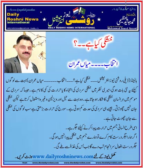 ہالینڈ(ڈیلی روشنی نیوز انٹرنیشنل ۔۔۔ خشکی کیا ہے؟۔۔۔ انتخاب ۔۔۔۔۔۔ میاں عمران)بہت سے لوگوں کیلئے یہ نئی بات ہوگی،میری نظر میں خشکی سردی کی انتہاء کا یا حرارت کی کمی کا نام ہے۔جیسا کہ سردی کے موسم میں ہرانسان خشکی کا شکار ہوجاتا ہے۔وہ بہت سے تیل اور ویزلین وغیرہ استعمال کرتا ہے لیکن خشکی جان نہیں چھوڑتی