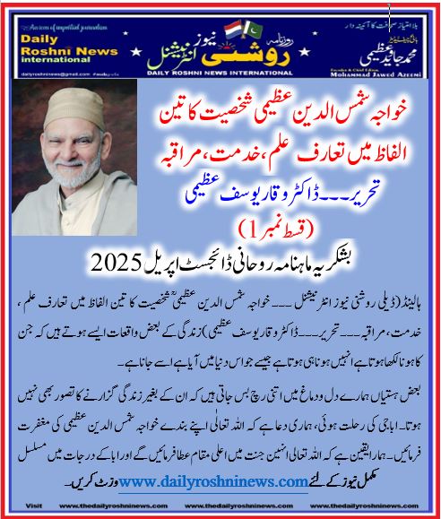ہالینڈ(ڈیلی روشنی نیوز انٹرنیشنل ۔۔۔ خواجہ شمس الدین عظیمی ؒ شخصیت کا تین الفاظ میں تعارف علم ، خدمت ، مراقبہ۔۔۔ تحریر۔۔۔ڈاکٹر وقار یوسف عظیمی )زندگی کے بعض واقعات ایسے ہوتے ہیں کہ جن کا ہونا لکھا ہوتا ہے انہیں ہونا ہی ہوتا ہے جیسے جو اس دنیا میں آیا ہے اسے جانا ہے۔