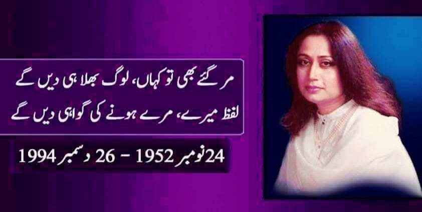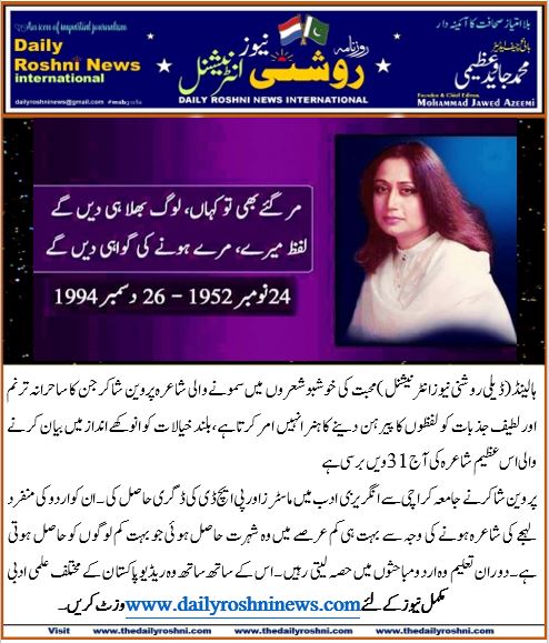 عظیم شاعرہ پروین شاکر 26 دسمبر 1994 کو ایک ٹریفک حادثے میں 42 برس کی عمر میں انتقال کر گئی تھیں، پروین شاکر اسلام آباد کے مرکزی قبرستان میں آسودۂ خاک ہیں۔