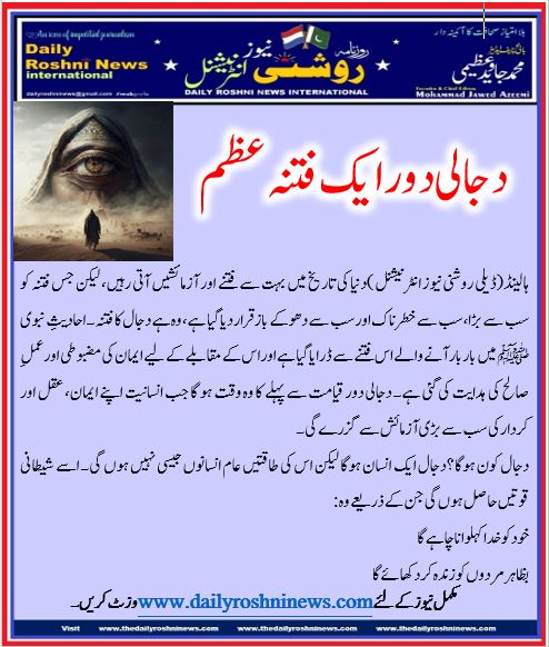 ہالینڈ(ڈیلی روشنی نیوز انٹرنیشنل )دنیا کی تاریخ میں بہت سے فتنے اور آزمائشیں آتی رہیں، لیکن جس فتنہ کو سب سے بڑا، سب سے خطرناک اور سب سے دھوکے باز قرار دیا گیا ہے، وہ ہے دجال کا فتنہ۔ احادیثِ نبوی ﷺ میں بار بار آنے والے اس فتنے سے ڈرایا گیا ہے اور اس کے مقابلے کے لیے ایمان کی مضبوطی اور عملِ صالح کی ہدایت کی گئی ہے۔ دجالی دور قیامت سے پہلے کا وہ وقت ہو گا جب انسانیت اپنے ایمان، عقل اور کردار کی سب سے بڑی آزمائش سے گزرے گی۔