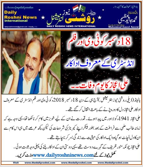 ہالینڈ(ڈیلی روشنی نیوز انٹرنیشنل )آج ہی کے دن 18 دسمبر 2018ء کو ٹی وی اور فلم انڈسٹری کے معروف اداکار علی اعجاز دل کا دورہ پڑنے کے باعث انتقال کر گئے تھے۔
