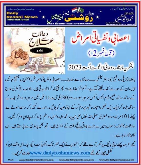 ہالینڈ(ڈیلی روشنی نیوز انٹرنیشنل۔۔۔ دعاؤں سے علاج۔۔۔ اعصابی و نفسیاتی امراض)مٹھیاں بھینچ جاتیں ہیں، ان کے منہ سے کف نکلنے لگتا ہے، جسم اکڑ جاتا ہے اور پھر چیخ مار کر اٹھ جاتی ہیں۔ جواب : ڈاکٹری علاج کے ساتھ ساتھ صبح و شام اکیس اکیس مرتبہ سورو روم (30) کی آیت 11 تین تین مرتبہ درود شریف کے ساتھ پڑھ کر ایک ایک ٹیبل اسپون شہد پر دم کر کے اپنی اہلیہ کو پلائیں۔ ان سے کہیں کہ رات سونے سے پہلے